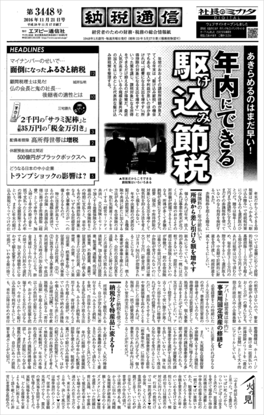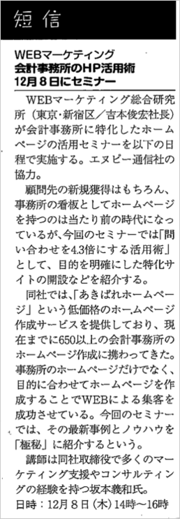 11月21日(月)に発行された納税通信(第3448号)に、会計・税理士事務所様向けのホームページ活用術に関するセミナー情報が掲載されました。