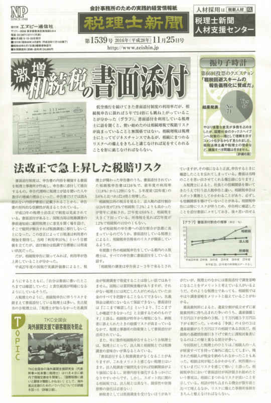 11月25日(月)発行の税理士新聞(第1539号)に、弊社WEBマーケティング総合研究所主催、エヌピー通信社さま協力「会計事務所のHP活用術」セミナーの情報が掲載されました。