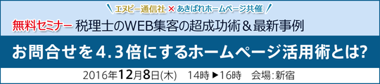| セミナー名 | エヌピー通信社×あきばれホームページ 税理士のWEB集客の超成功術と最新事例をいち早くご紹介! お問合せを4.3倍にするホームページ活用術 ~特化サイトが成功の鍵!~ |